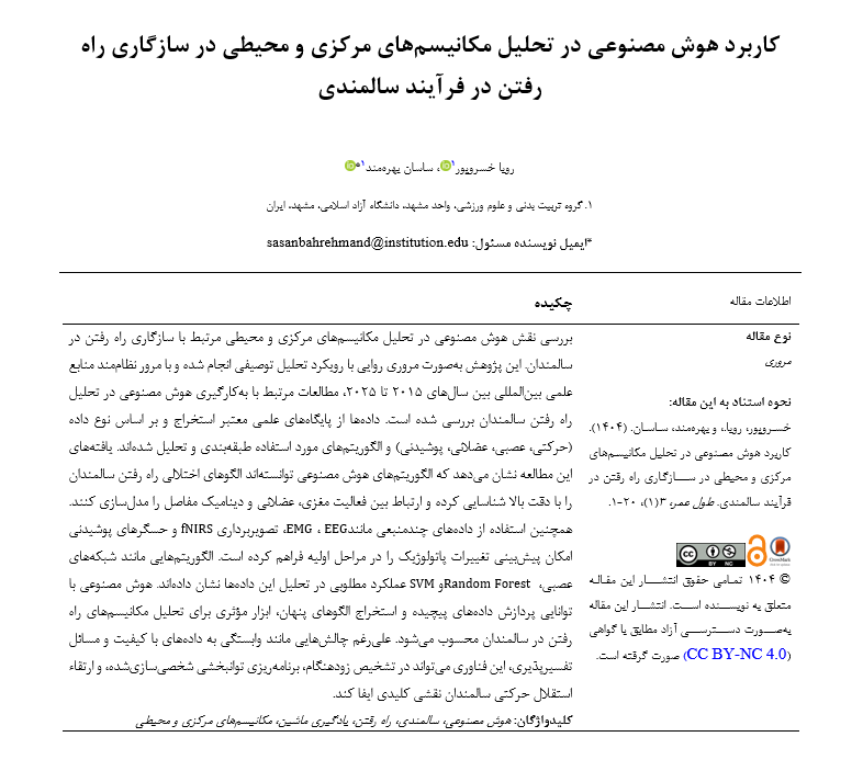 کاربرد هوش مصنوعی در تحلیل مکانیسمهای مرکزی و محیطی در سازگاری راه رفتن در فرآیند سالمندی